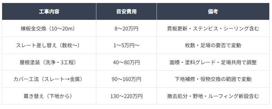 ※屋根補修は「部分補修(棟板金・差し替え等)」から「屋根塗装」「葺き替え・カバー」まで幅広く対応。現地診断後に最適プランをご提示します。