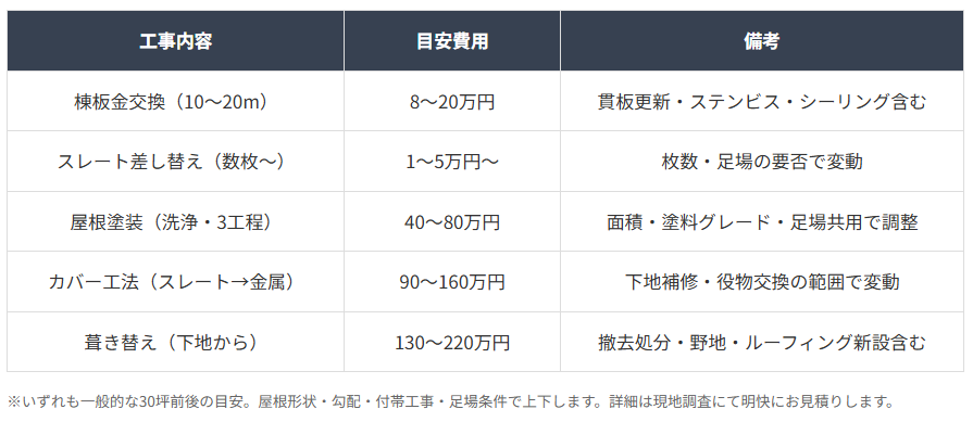 ※いずれも一般的な30坪前後の目安。屋根形状・勾配・付帯工事・足場条件で上下します。詳細は現地調査にて明快にお見積りします。