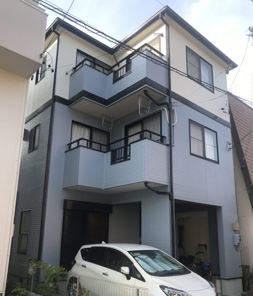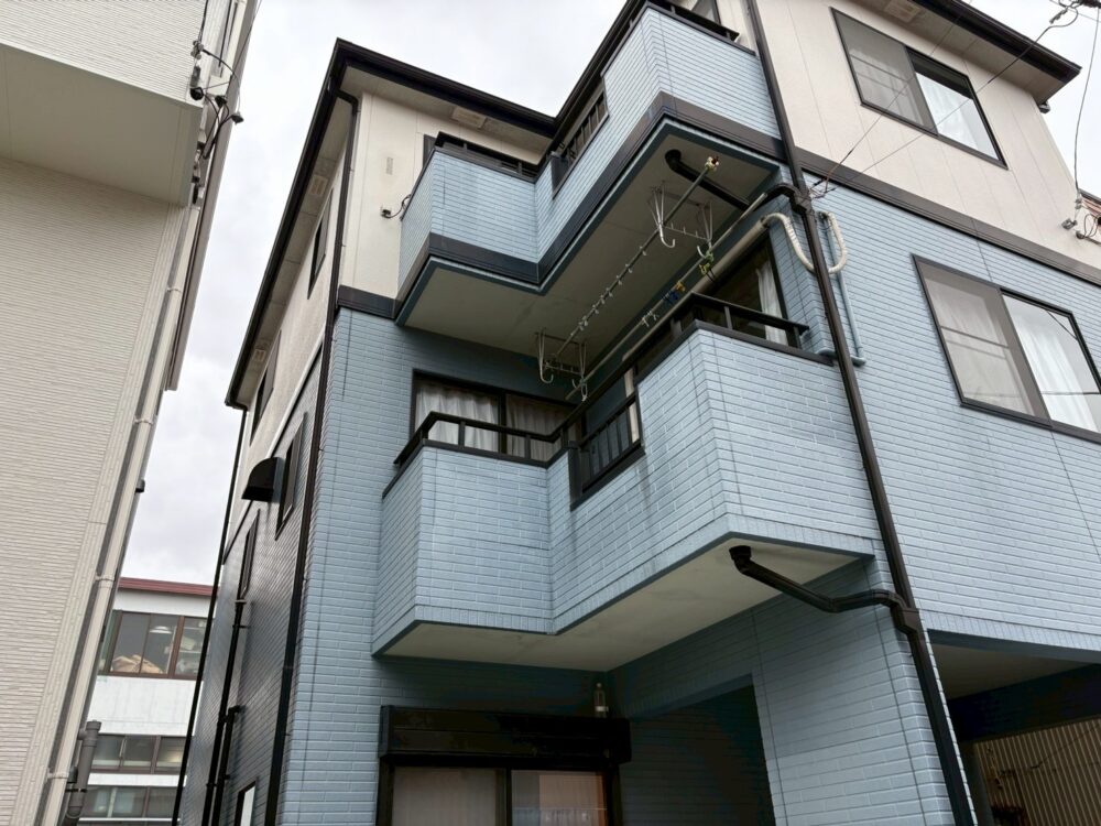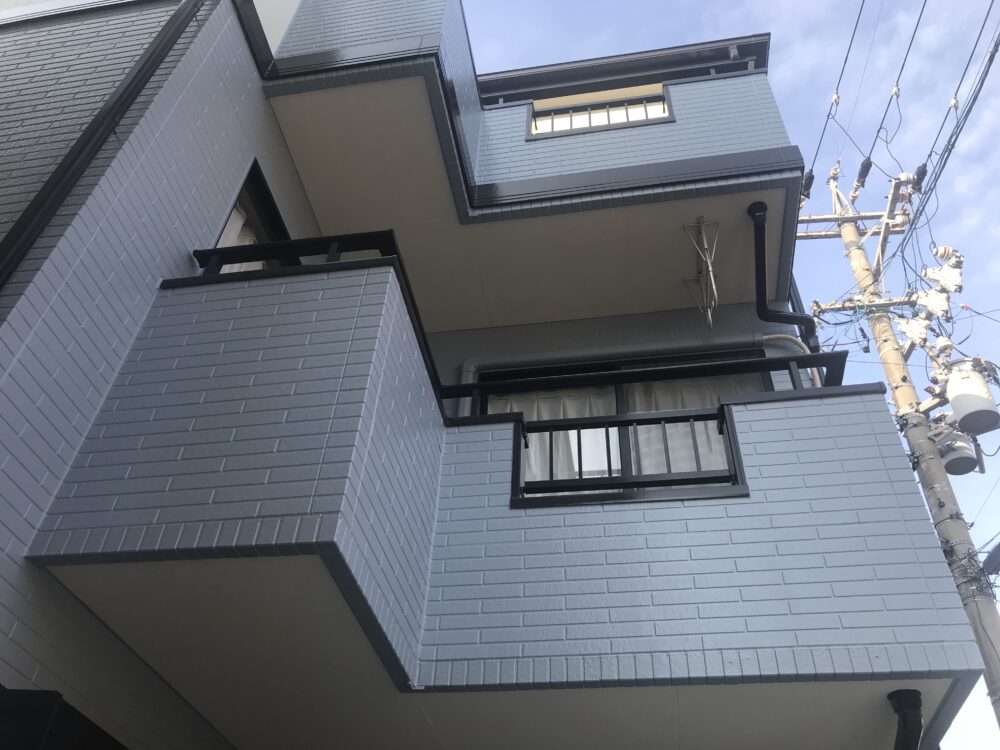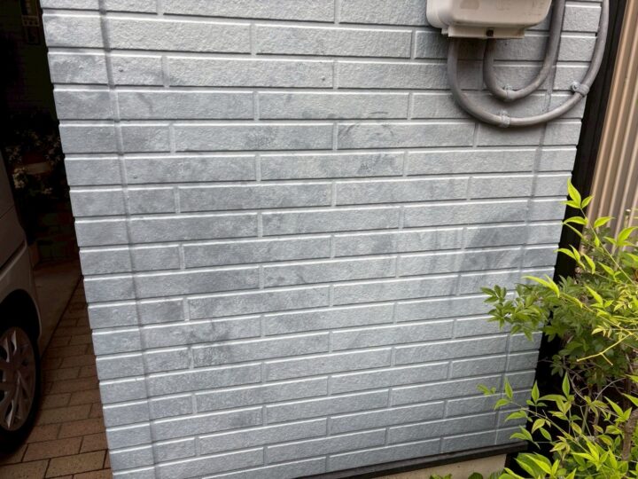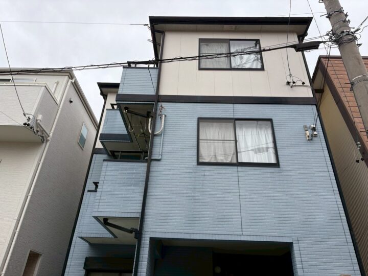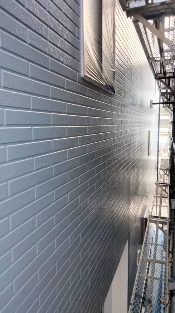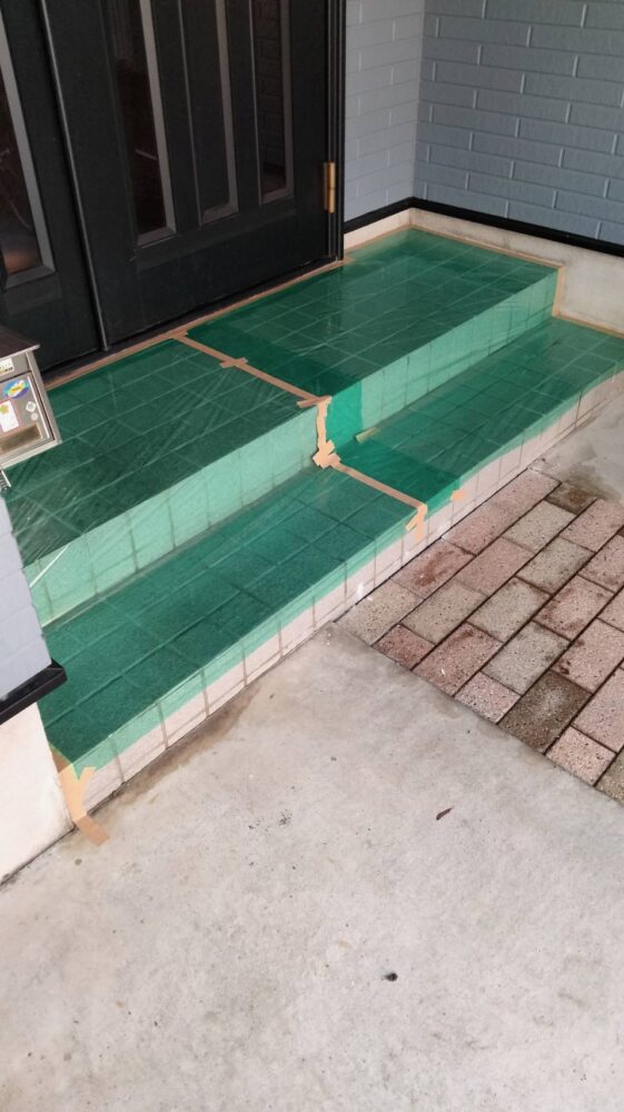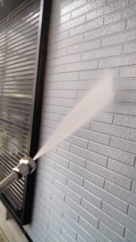 まずは高圧洗浄を行います。古い汚れをしっかり落とすことで見た目が綺麗になるのはもちろん、このあとの塗料の密着性が良くなります!養生作業