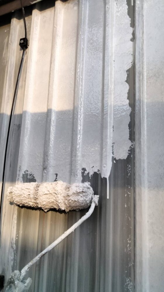 外壁使用塗料 | ロックペイント ロックハイパーリアクターコート無機(トタン:ブルーグレイ/モルタル:ブロークンホワイト) 塗料の特徴はこちらから! |