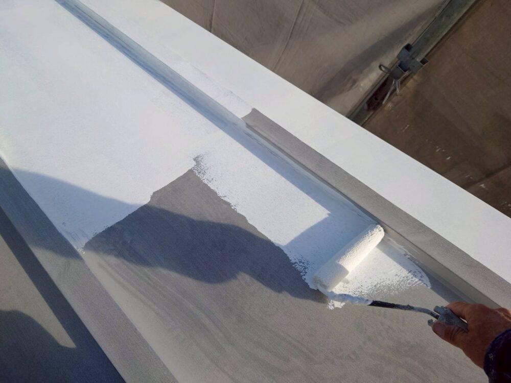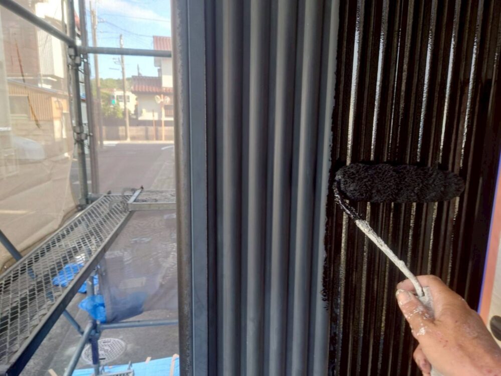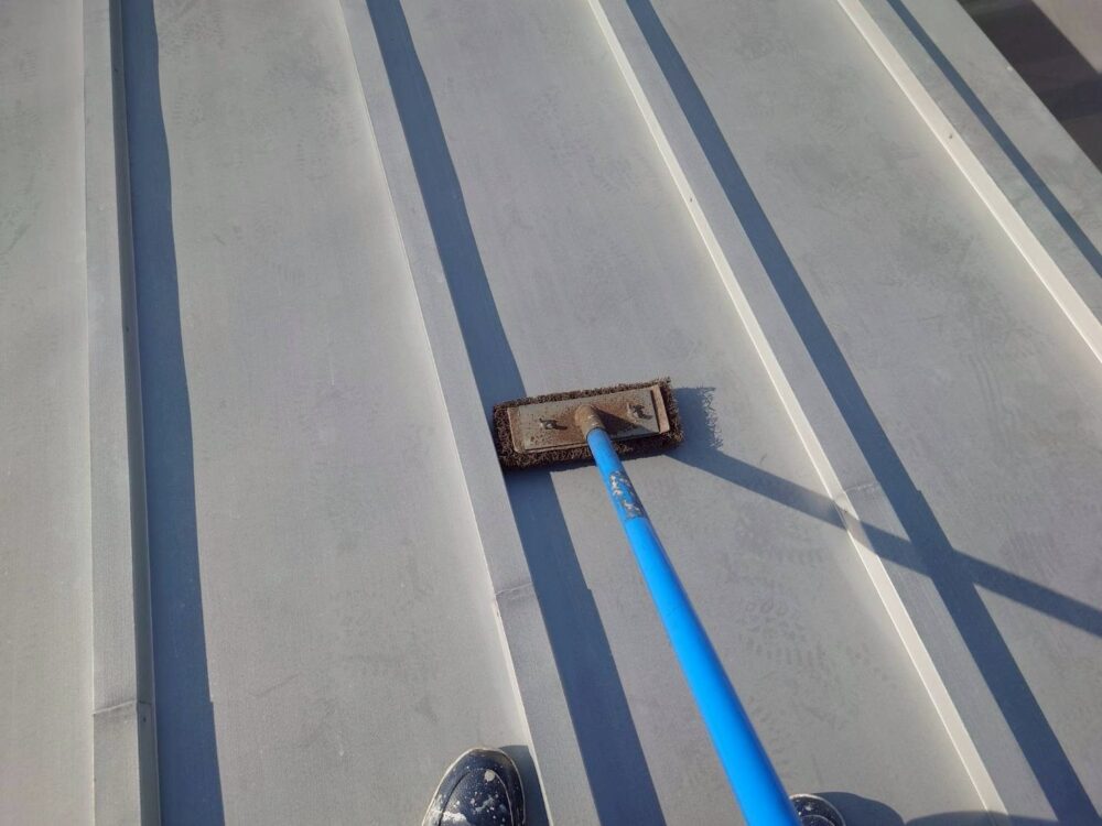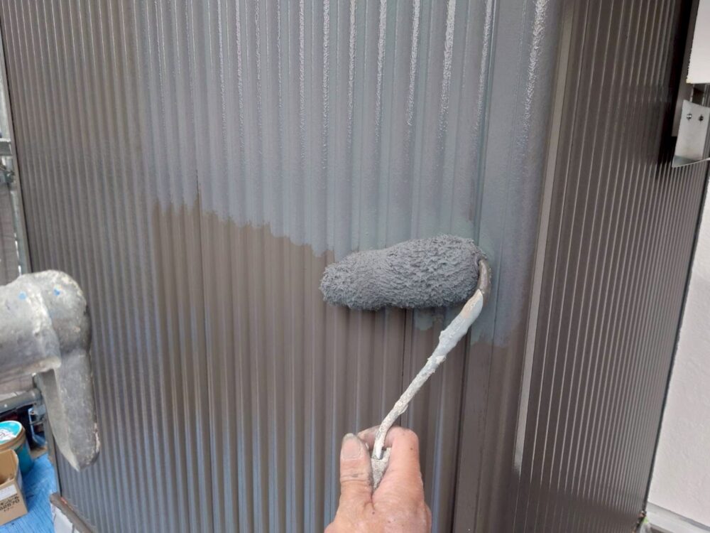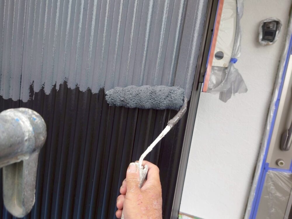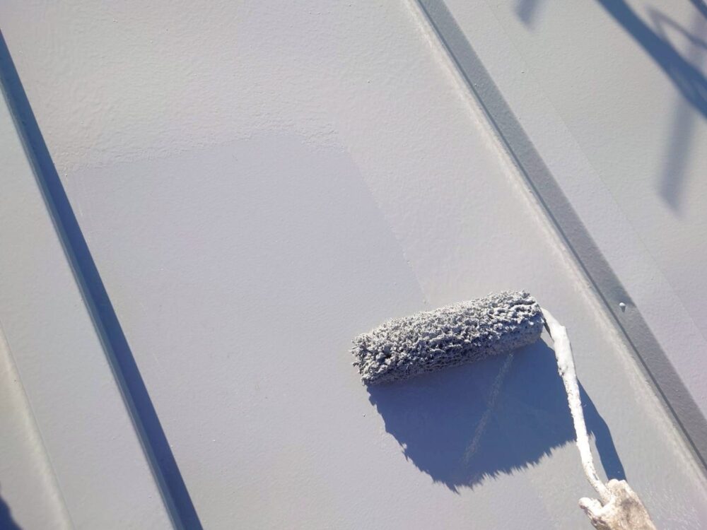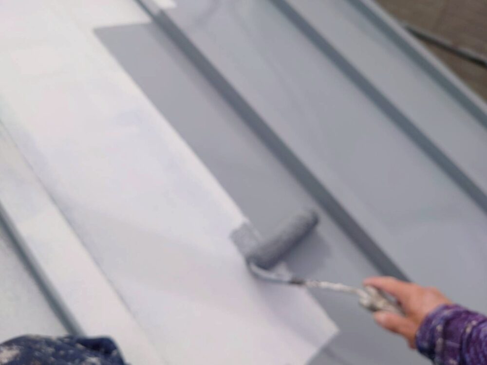 屋根の中塗りを行います。仕上げ塗料は2回に分けて塗布するのが基本です。