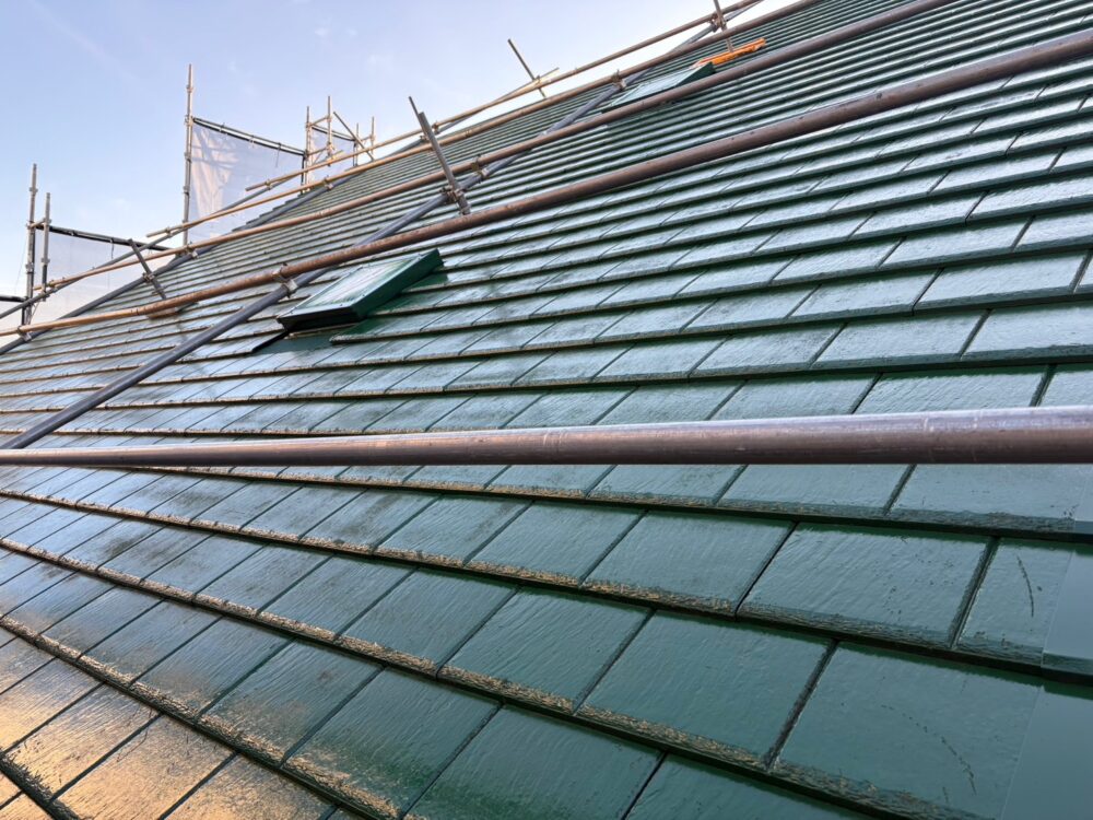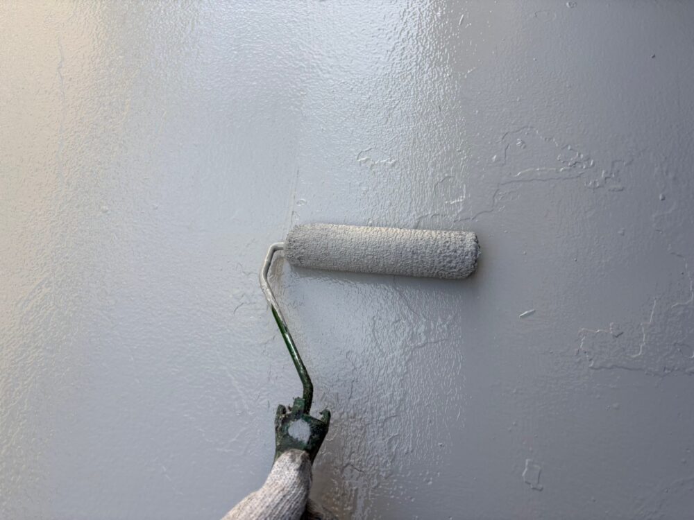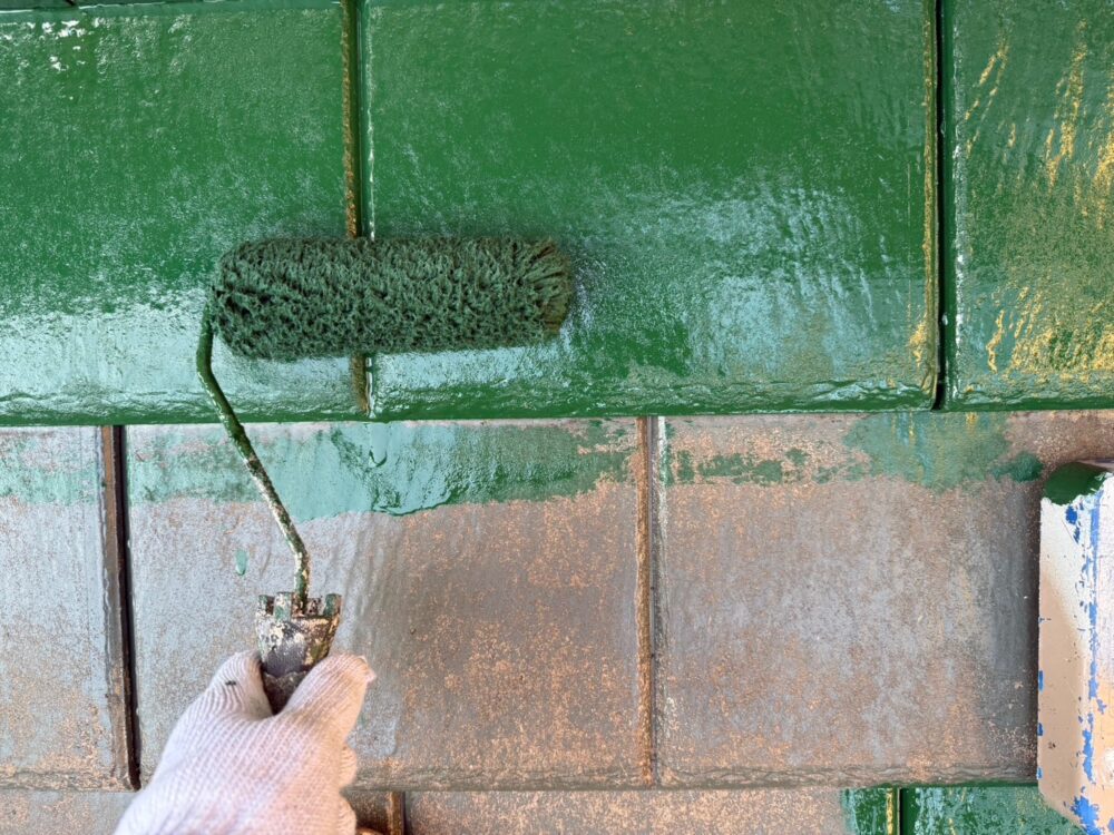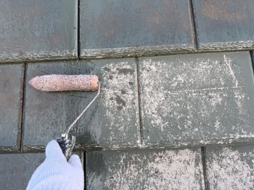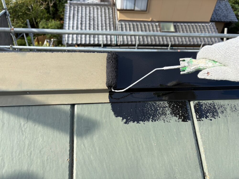 屋根の中塗りを行います。仕上げ塗料は2回に分けて塗布するのが基本です。