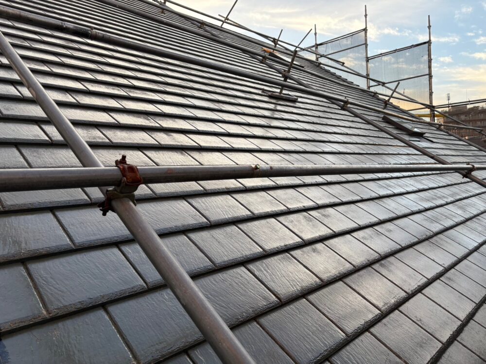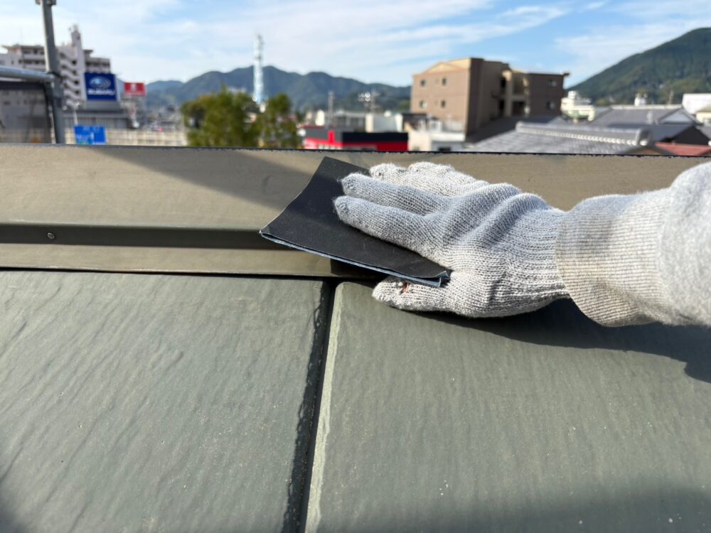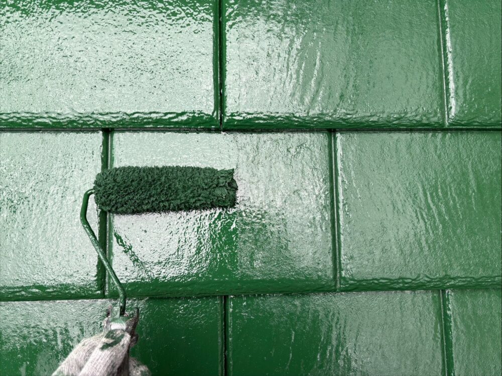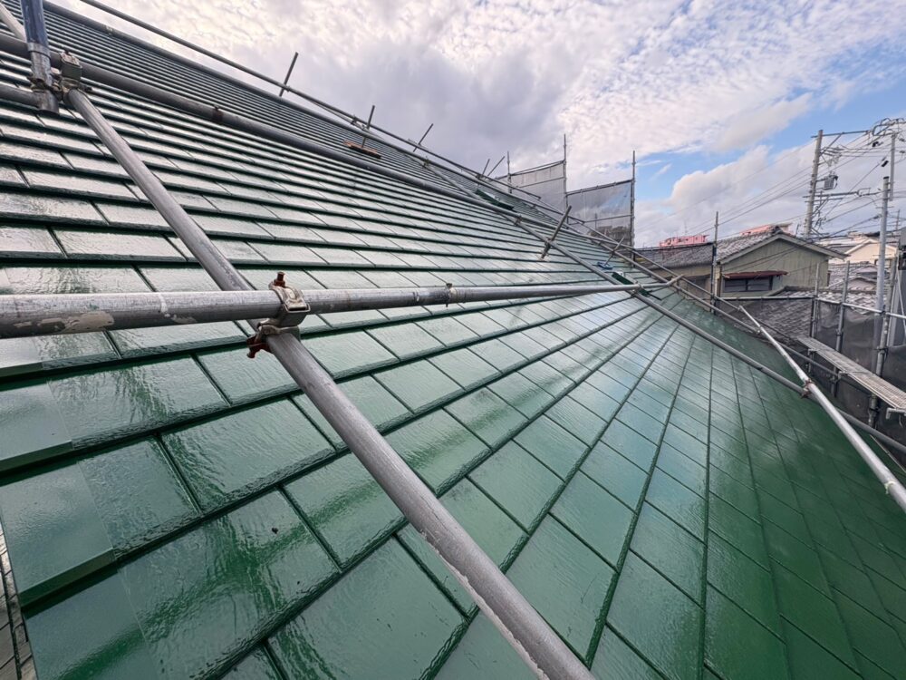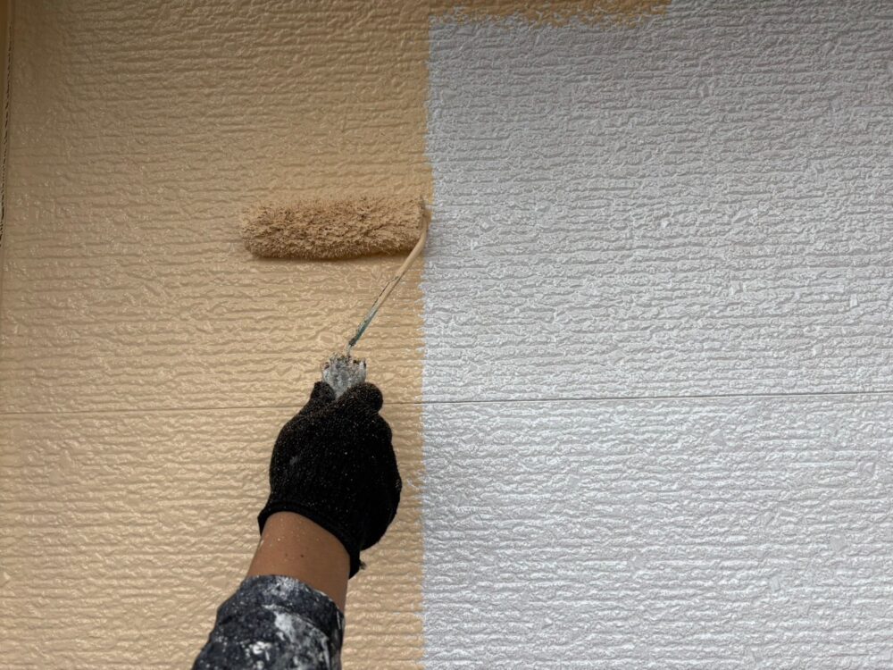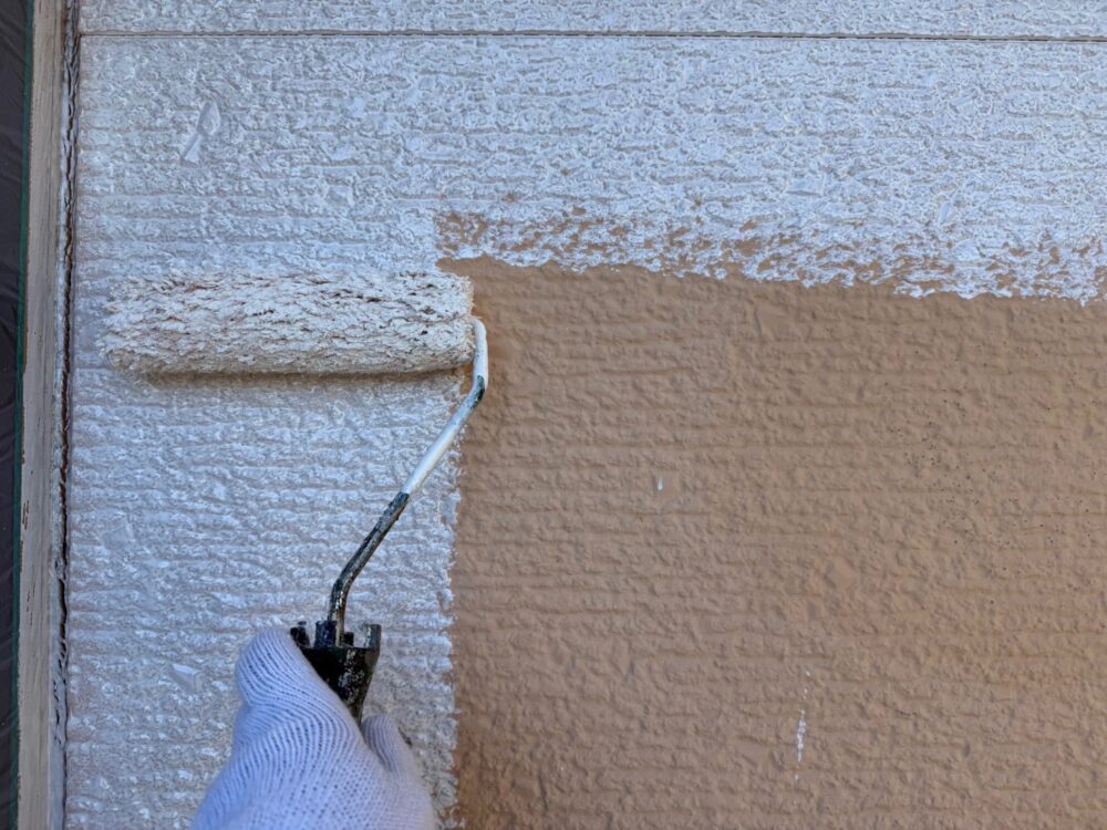 屋根の中塗りを行います。仕上げ塗料は2回に分けて塗布するのが基本です。