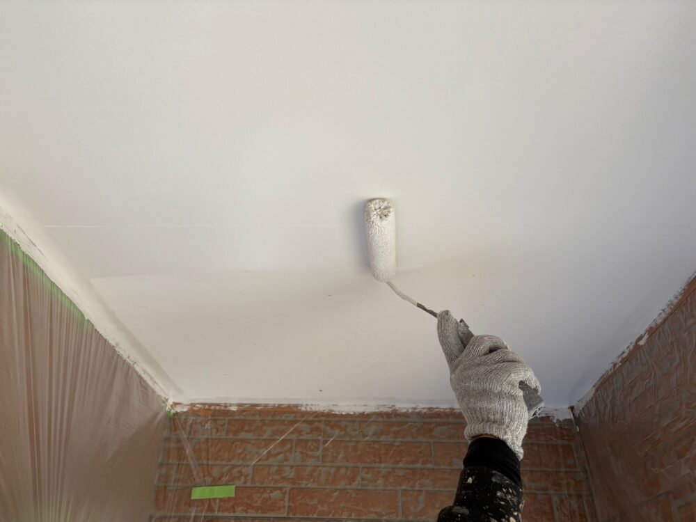 軒天塗装。こちらも中塗り・上塗りと2回に分けて塗布していきます。