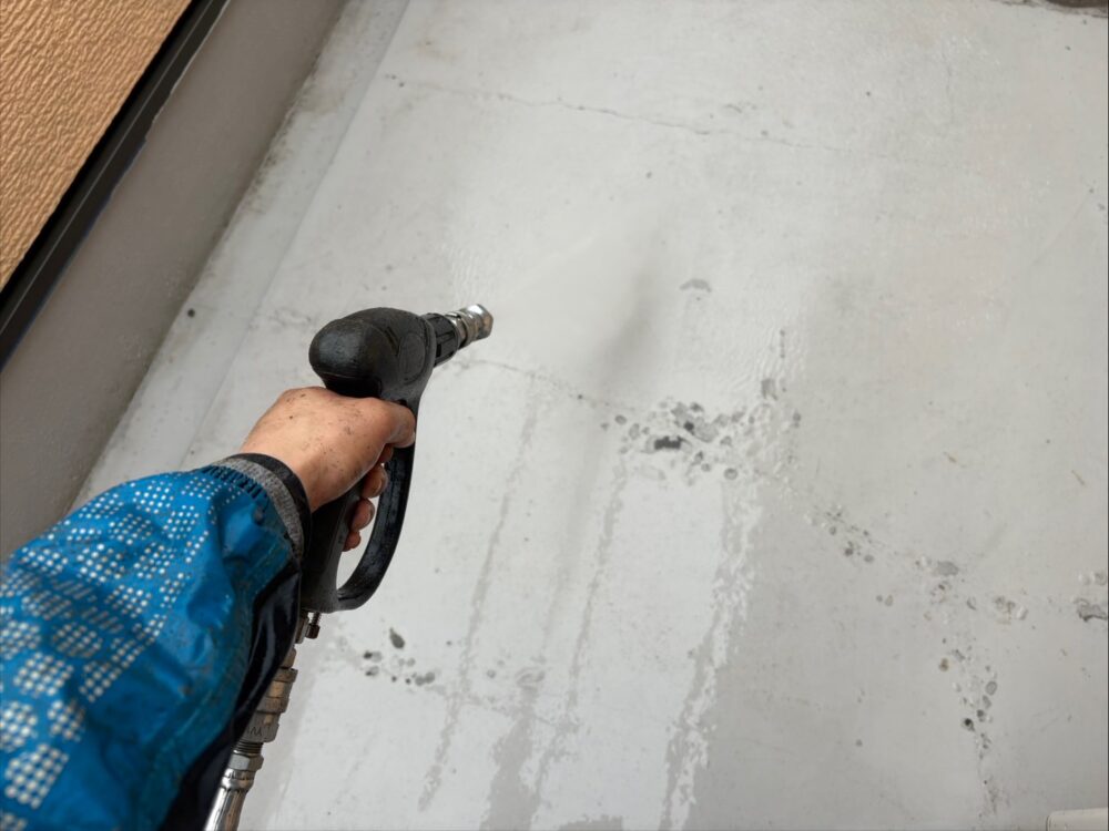 高圧洗浄をして古い塗膜や汚れを落としていきます。塗料の密着性の向上に繋がります。