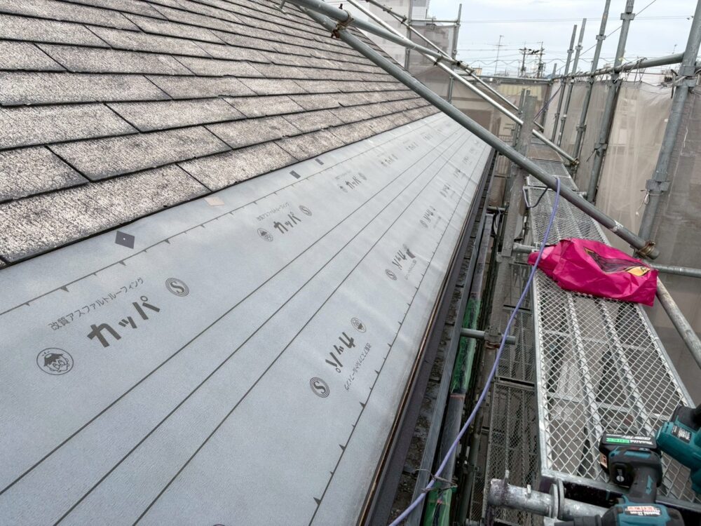 屋根カバー工法を行います。ルーフィングシートの敷設を行います。