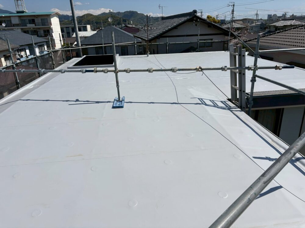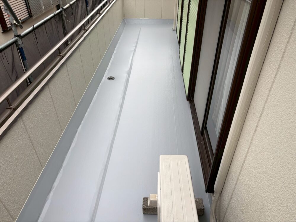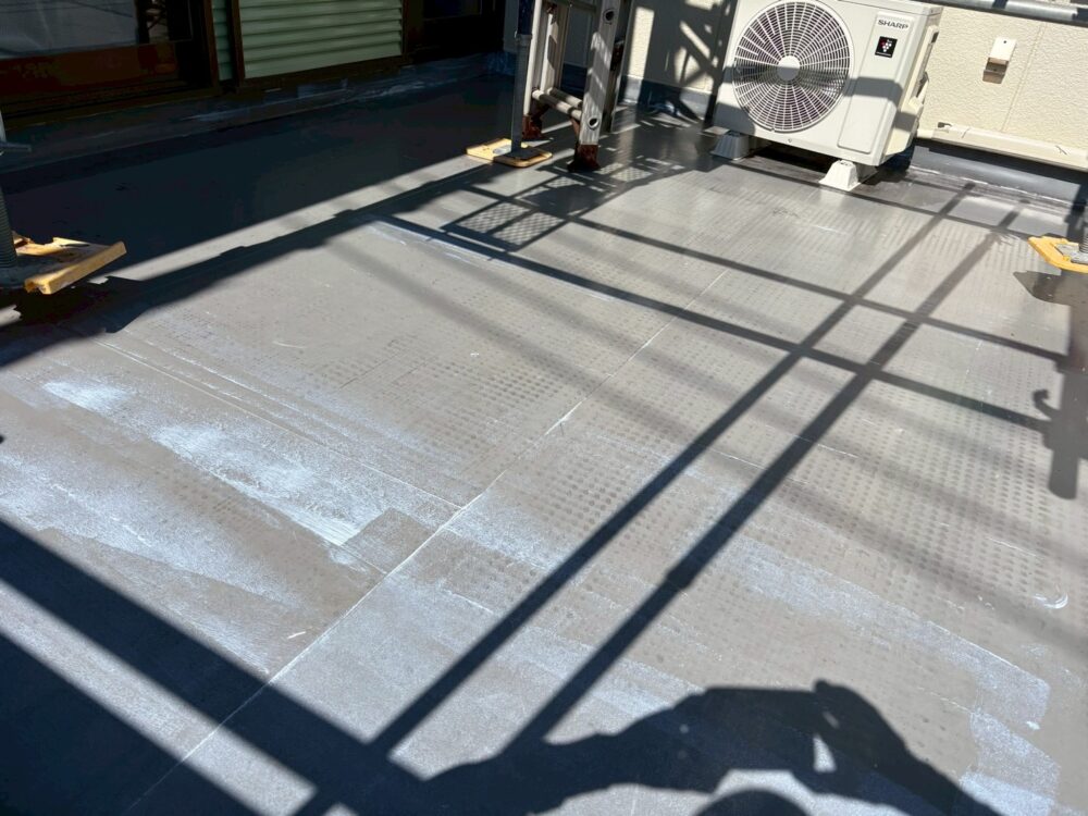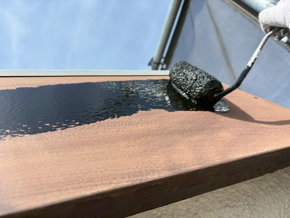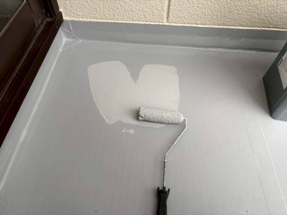 トップコートを2回に分けて塗布します。トップコートは防水層を紫外線等から守ってくれる役割があります。定期的なメンテナンスが必須です。